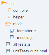 In this example shown above, the files being tested are webapp/model/formatter.js and webapp/model/models.js. You may be using JavaScript files or html files to run your tests, depending on the runners you are executing your tests with. We recommend using .js files for writing your tests, so that you can run them with tools such as karma for instance.