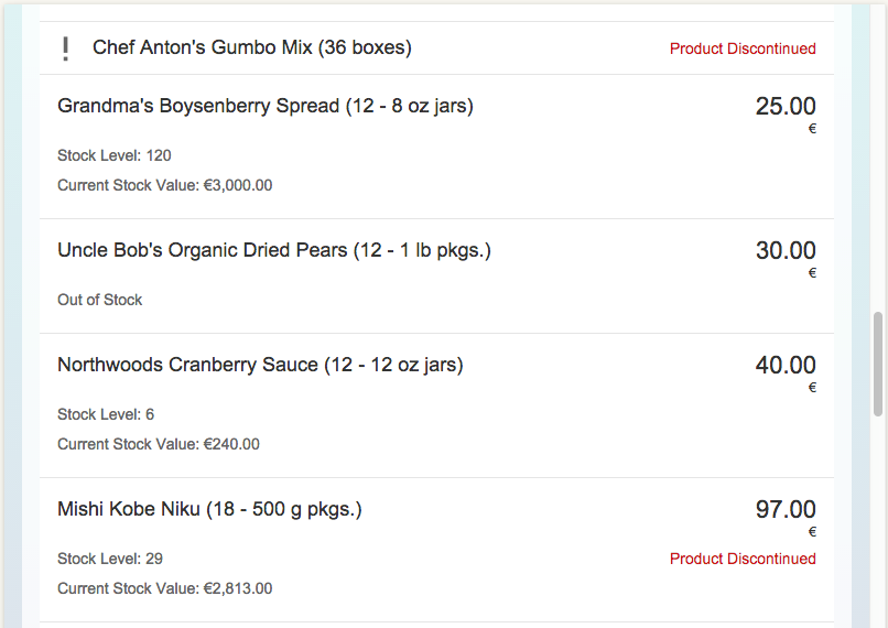 If the stock level is zero and the product has also been discontinued, then use a StandardListItem with a warning icon and a Product Discontinued message in the status property. All other possibilities will use an ObjectListItem.