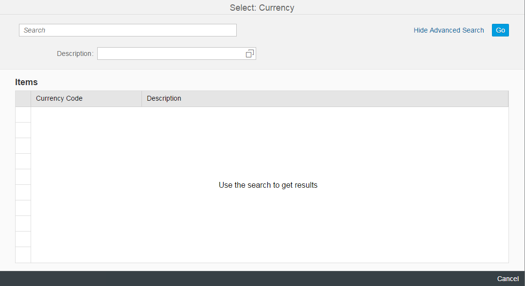 We would like to stress the importance of this feature with a dedicated example, even though you might argue that this is just another feature of the SmartField control. In the following example, we see a value help for a currency code. By providing a value help, the user can find the correct currency by firing a query with complex input parameters. Surely, you can imagine that there are more complex examples in which specifying the correct value is almost impossible without performing a query. For example, when providing a customer ID, you would want to find this based on the last name of the customer.