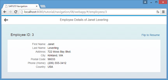 You can go to webapp/index.html#/employees/3 and click on the Flip to Resume link to be redirected with a nice flip transition to the employee’s resume. The back navigation uses a reverse flip navigation to get back to the Employee Details page. You can also directly navigate to webapp/index.html#/employees/3/resume or webapp/index.html#/employees/33/resume to see what happens.