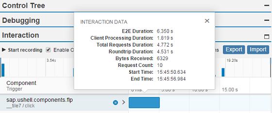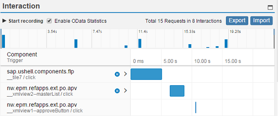 With this feature, you can collect and visualize the performance data collected for the interaction steps in an easy and intuitive way. In addition, you can enable statistics for OData calls that give you information about the app processing time taken by the OData back end.