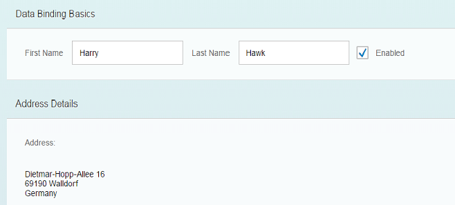 #!xml<mvc:View xmlns="sap.m" xmlns:l="sap.ui.layout" xmlns:mvc="sap.ui.core.mvc"> <Panel headerText="{i18n>panel1HeaderText}" class="sapUiResponsiveMargin" width="auto"> <content> <Label text="{i18n>firstName}" class="sapUiSmallMargin" /> <Input value="{/firstName}" valueLiveUpdate="true" width="200px" enabled="{/enabled}" /> <Label text="{i18n>lastName}" class="sapUiSmallMargin" /> <Input value="{/lastName}" valueLiveUpdate="true" width="200px" enabled="{/enabled}" /> <CheckBox selected="{/enabled}" text="{i18n>enabled}" /> </content> </Panel> <Panel headerText="{i18n>panel2HeaderText}" class="sapUiResponsiveMargin" width="auto"> <content> <l:VerticalLayout> <Label class="sapUiSmallMargin" text="{i18n>address}:" /> <Text class="sapUiSmallMargin" text="{/address/street}\n{/address/zip} {/address/city}\n{/address/country}" width="200px" /> </l:VerticalLayout> </content> </Panel> </mvc:View>