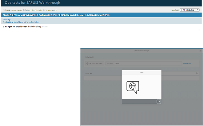 When you call the webapp/test/integration/opaTests.qunit.html page of your project on the server, you should see the QUnit layout and a test “Should see the hello dialog” is executed immediately. It will load the app in a small iFrame in the lower right of the page. There you can see what operations the test is performing on the app, if everything works correctly the button click is triggered, then a dialog is shown and the test case is green.