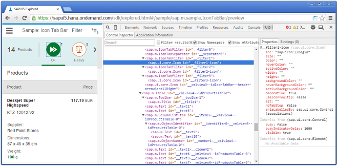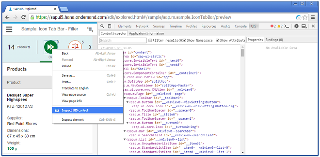 Inspect SAPUI5 controls and review their properties, bindings, and data model