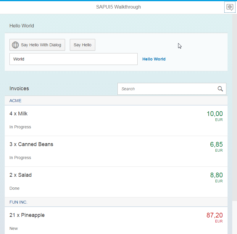 </mvc:View>We add a declarative sorter to our binding syntax. As usual, we transform the simple binding syntax to the object notation, specify the path to the data, and now add an additional sorter property. We specify the data path by which the invoice items should be sorted, the rest is done automatically. By default, the sorting is ascending, but you could also add a property descending with the value true inside the sorter property to change the sorting order.