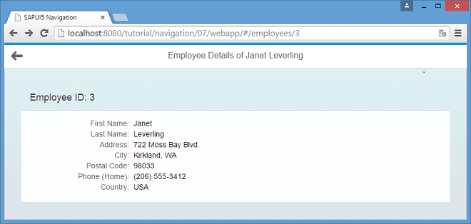 The detail page has to read the ID of the employee from the URL to fetch and display the employee data from the server. If the employee was not found, for example, because an invalid employee ID was passed on, we want to inform the user by displaying the notFound target. Of course, the back navigation has to work as well for this page.