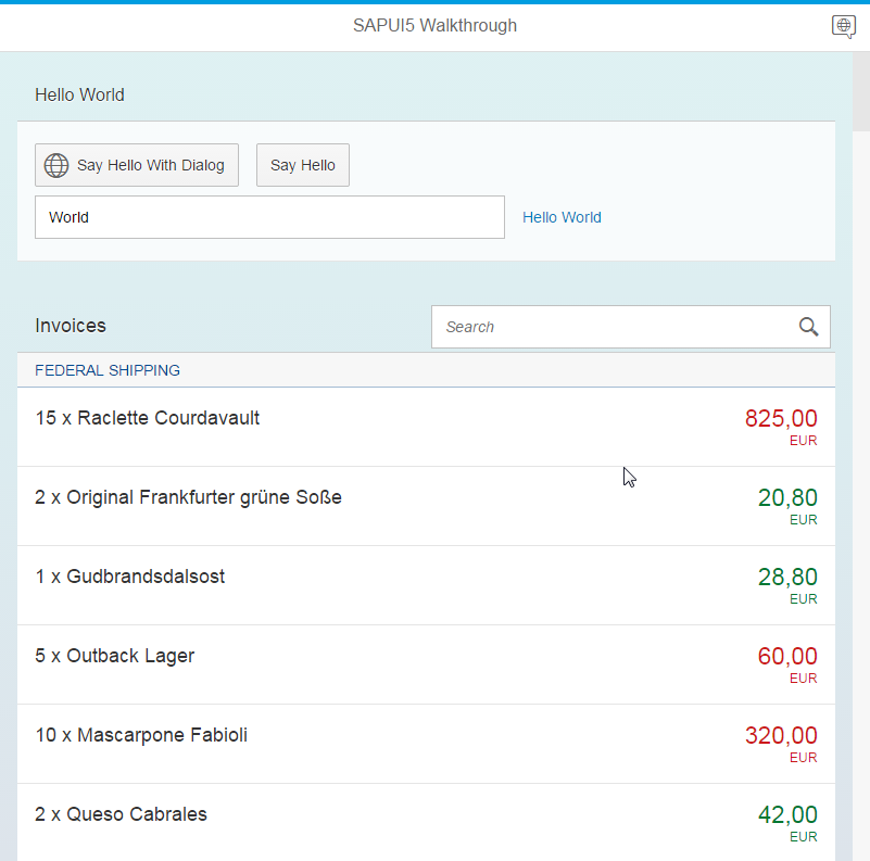 When using the data source invoiceRemote, the ODataModel fetches the data from the real Northwind OData service. The invoices we receive from the Northwind OData service have identical properties as the JSON data we used previously (except for the status propertythat is not available in the Northwind OData service).