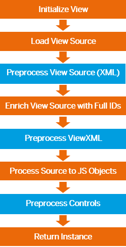The following figure shows the different stages of view initialization. There are three hooks, XML, ViewXML and controls, which differ mainly in the source that is passed to the preprocessor.