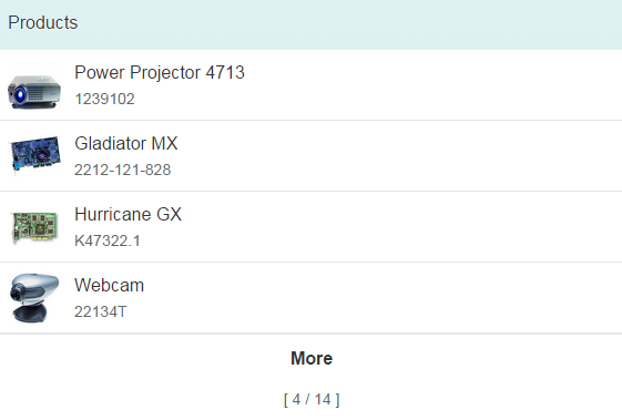 To enable data for a table to be fetched on demand like this, you just need to set the values for these properties appropriately on your table control. For example, adding the highlighted lines as shown in the following code will cause five items to be displayed in the table initially along with a More button (this is the default text used if you don't set a different text using the growingTriggerText property), as shown below the code: