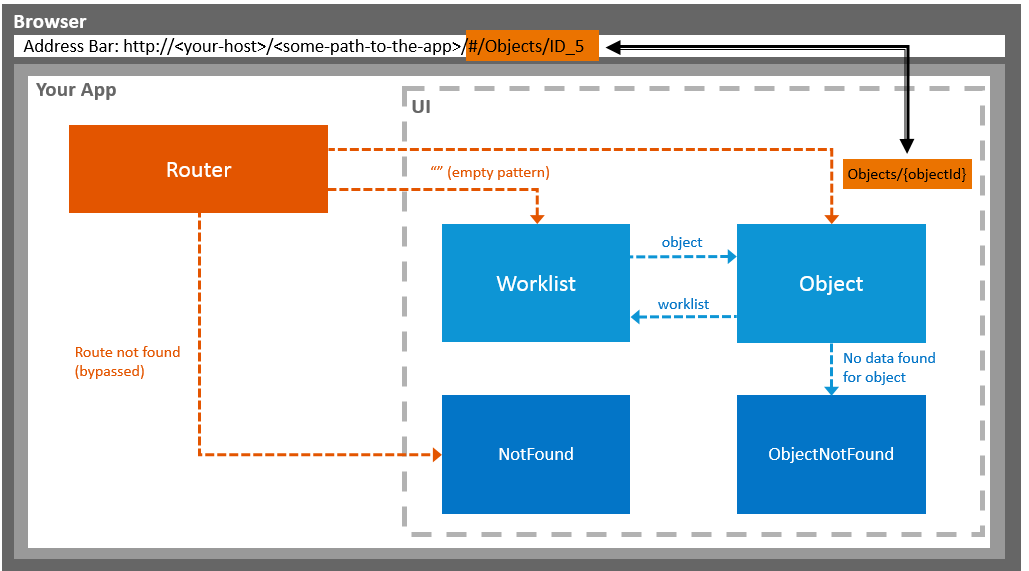 }If the object route matches – an ID is passed (for example #/Objects/1337) but the back end does not contain an object with the ID 1337, then you need to display the objectNotFound page. This is achieved by listening to the “change” event of a binding. Inside this, you check if there is no data and tell the router to display the objectNotFound target, as shown in the sample code below: