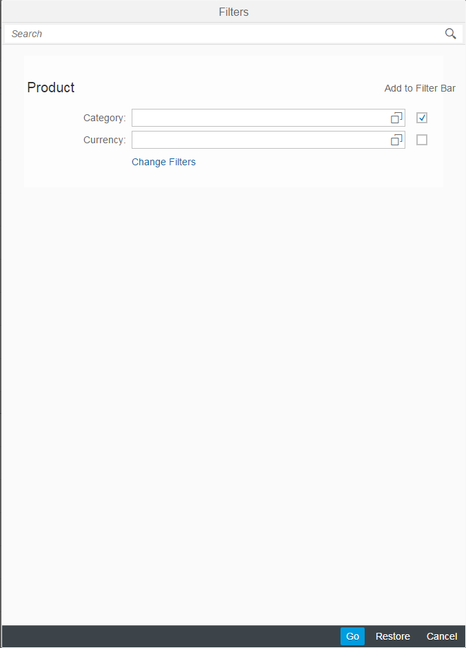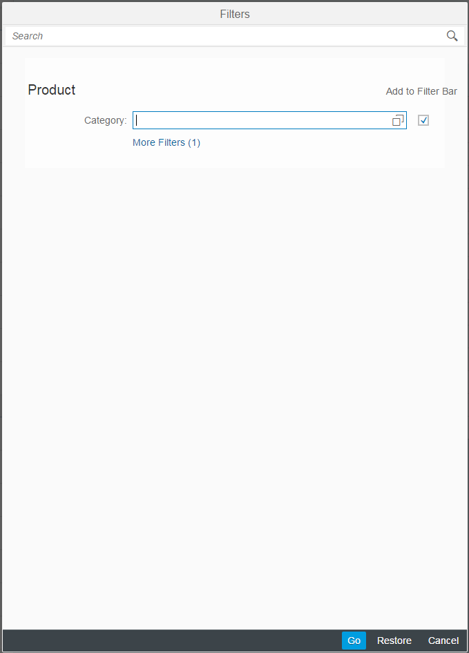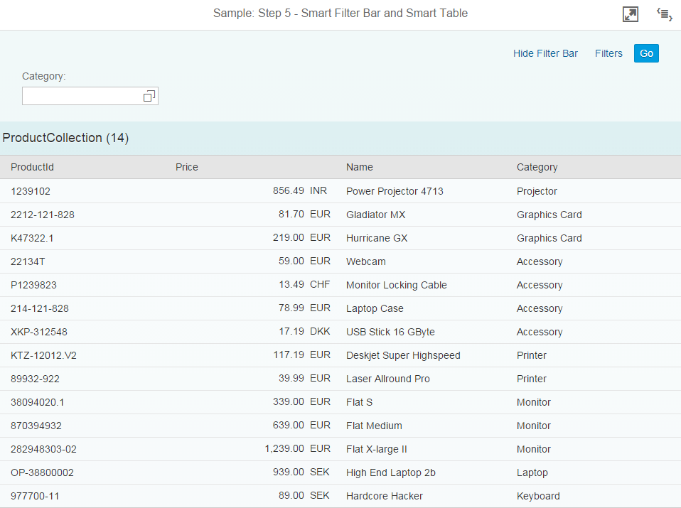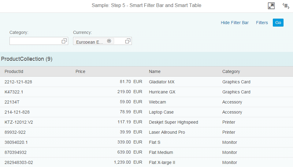 #!xml<mvc:View xmlns="sap.m" xmlns:mvc="sap.ui.core.mvc" controllerName="sap.ui.demo.smartControls.SmartTable" xmlns:smartFilterBar="sap.ui.comp.smartfilterbar" xmlns:smartTable="sap.ui.comp.smarttable"> <smartFilterBar:SmartFilterBar id="smartFilterBar" entityType="Product"> <smartFilterBar:controlConfiguration> <smartFilterBar:ControlConfiguration key="Category" visibleInAdvancedArea="true" preventInitialDataFetchInValueHelpDialog="false"> </smartFilterBar:ControlConfiguration> </smartFilterBar:controlConfiguration> </smartFilterBar:SmartFilterBar> <smartTable:SmartTable id="smartTable_ResponsiveTable" smartFilterId="smartFilterBar" tableType="ResponsiveTable" editable="false" entitySet="Products" useVariantManagement="false" useTablePersonalisation="false" header="Products" showRowCount="true" useExportToExcel="false" enableAutoBinding="true"> </smartTable:SmartTable> </mvc:View>