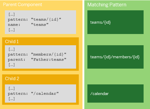To do so, you add a parent parameter to the route definition in the routing configuration (see Routing Configuration) of the child (inner) component to refer to the route that is defined in the parent (outer) component.