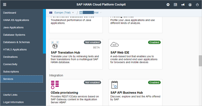 After logging on, choose Services in the navigation bar of the SAP BTP cockpit and open the detailed information on your SAP Web IDE by choosing the SAP Web IDE tile.