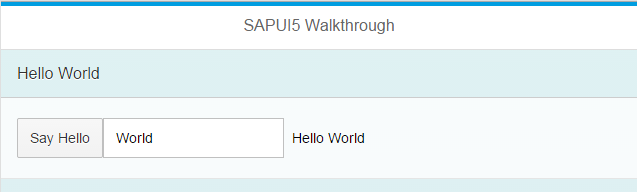 #!xml<mvc:View controllerName="sap.ui.demo.wt.controller.App" xmlns="sap.m" xmlns:mvc="sap.ui.core.mvc" displayBlock="true"> <App> <pages> <Page title="{i18n>homePageTitle}"> <content> <Panel headerText="{i18n>helloPanelTitle}"> <content> <Button text="{i18n>showHelloButtonText}" press="onShowHello"/> <Input value="{/recipient/name}" description="Hello {/recipient/name}" valueLiveUpdate="true" width="60%"/> </content> </Panel> </content> </Page> </pages> </App> </mvc:View>