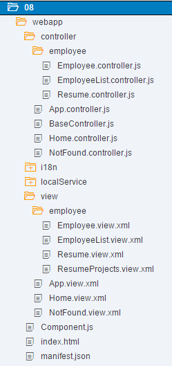 });Create a file Resumee.controller.js in the webapp/controller/employee folder. In this controller, we make sure to bind the view to the correct employee whenever the employeeResume route has matched. We have already used this approach in the previous step so you should be able to recognize the building blocks in the code above. Again, in case the user cannot be found we display the notFound target.