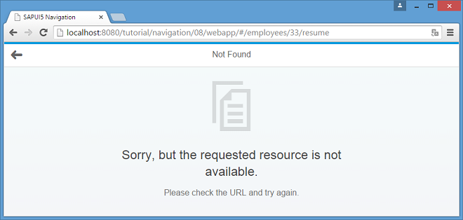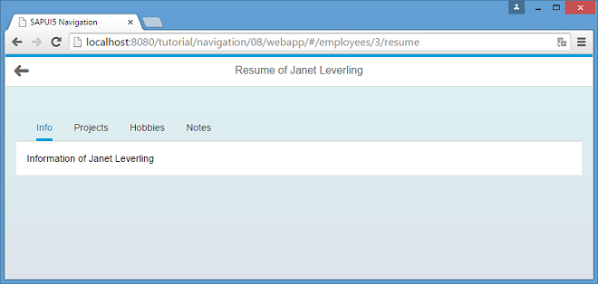 You can go to webapp/index.html#/employees/3 and click on the Flip to Resume link to be redirected with a nice flip transition to the employee’s resume. The back navigation uses a reverse flip navigation to get back to the Employee Details page. You can also directly navigate to webapp/index.html#/employees/3/resume or webapp/index.html#/employees/33/resume to see what happens.