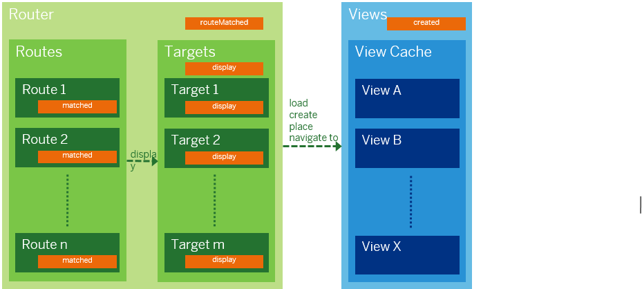 These events are fired when a hash matches a route or a pattern. The attachRouteMatched event is fired if a pattern of any route in the routing configuration is matched. The attachMatched event is fired for a specific route.