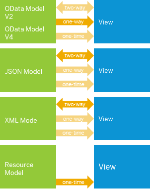 The binding mode defines how the data sources are bound. The different model implementations require specific binding modes. The resource model, for example, only supports one-time binding, that is, a binding from the model to the view.