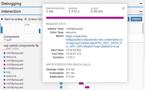 With this feature, you can collect and visualize the performance data collected for the interaction steps in an easy and intuitive way. In addition, you can enable statistics for OData calls that give you information about the app processing time taken by the OData back end.