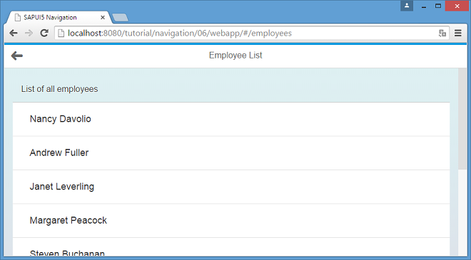 Now you can open the app and press the Show Employee List button to navigate to the employee list. From there, you can press either the browser’s or the app’s Back button to get back to the home page.