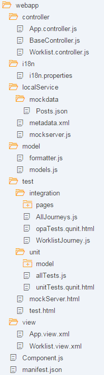 Integration tests are written in OPA5 – a tool for integration testing that is included in SAPUI5 – and can be found in the webapp/test/integration folder. You can start all OPA5 tests by calling the opaTests.qunit.html file in the same folder. OPA5 tests are organized in test journeys, and there is already a worklist journey included that checks if the table of posts is displayed properly. We will explain more details about the integration test setup later.