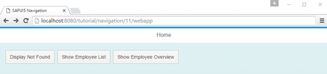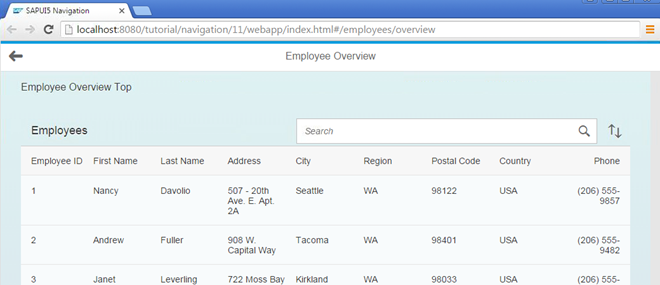 In this step, we will add a new button to the home page to illustrate the usage of multiple targets for a route. When the button is pressed, a new page opens that contains two parts: a header part at the top and a content part. The content part displays a table of employees that can be sorted and searched. We will use the array notation in the routing configuration to assign multiple targets to a route - a feature that we have not yet introduced.