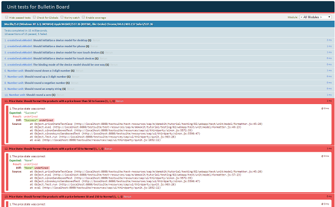 That’s it, you just wrote your first unit test. When you call the webapp/test/unit/unitTests.qunit.html file in your browser, you can see that the first module for the number unit formatter is still green but our price state tests are red and failing. The error message tells us that the result of the empty formatter function is not as expected.