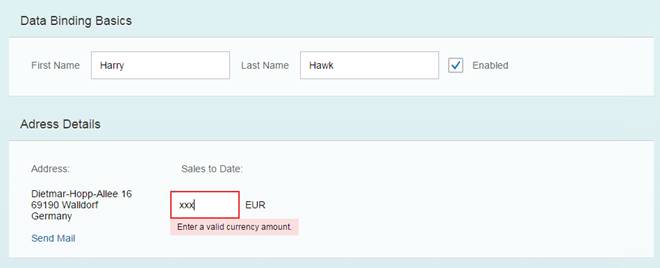 You can now enter a non-numeric value into the Sales To Date field and either press Enter or move the focus to a different UI control. This action triggers either the onenter or onchange event and then SAPUI5 executes the validation function belonging to the sap.ui.model.type.Currency data type.