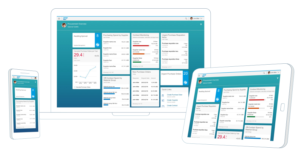Developers can build overview pages using a dedicated plugin in SAP Web IDE. End users then access overview pages from SAP Fiori launchpad, where each overview page is represented as a tile. End users can use a filter to narrow down the information displayed, or opt to hide cards when focusing on a particular topic. The displayed data is fully interactive, with clickable areas for easy navigation to relevant applications. Based on SAP Fiori, overview pages organize action items in an attractive and efficient way, with a fully responsive user interface.