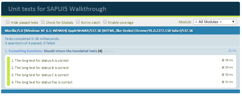 After requiring some basic QUnit functionality (for technical reasons we cannot do this asynchronously with our sap.ui.require syntax), we load and thus execute our formatter. Other QUnit tests can be added here as well. If we now open the webapp/test/service/unit/unitTests.qunit.html file in the browser, we should see our test running and verifying the formatter logic.
