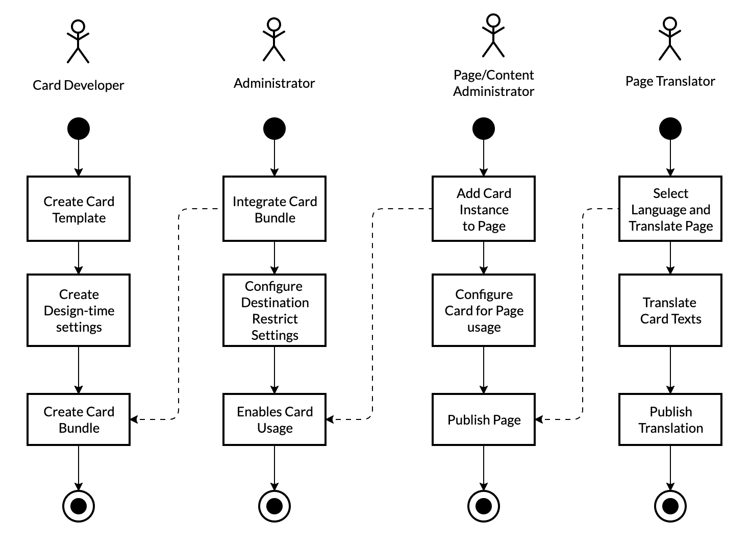 A Translator is responsible for text translations. While most often a Page/Content Administrator will maintain certain settings only in one language, the translator is involved in the internationalization. This persona is familiar with the context terminology for the card end-users.